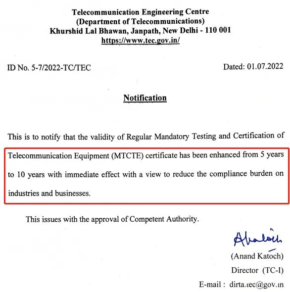2022年7月1日,印度TEC發布通知,將常規 (TEC)MTCTE 證書的有效期從5年延長到至10 年。生效日期:自通知發布日期起立即生效。