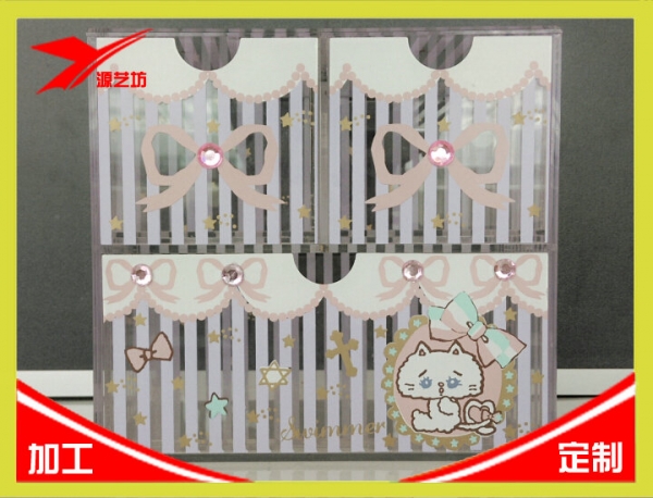 亞克力化妝品|首飾收納盒 尺寸:長寬高:14.5*12*13.5CM 結構:2個小抽屜 1個大抽屜 風格:時尚,卡通 2014新款出口收納盒 采用透明亞克力材質,藍色表面絲印線條,搭配小星星圖案,拉手處U型小曹設計方便抽拉,在搭配小磚石點綴,放在桌面上美觀大方。 如果你想要干凈整潔的化妝臺,那么只需要擁有一個亞克力收納盒就夠了,可以讓你把這些東西細分,更充分的利用空間,更好的將自己的小物品分類。 亞克力收納盒光潔度高,造型雅致,實用性強,使用方便,雙層間隔方便收納整理分類,不需要花太多時間就能讓首飾和化妝品擺放的整齊有序。